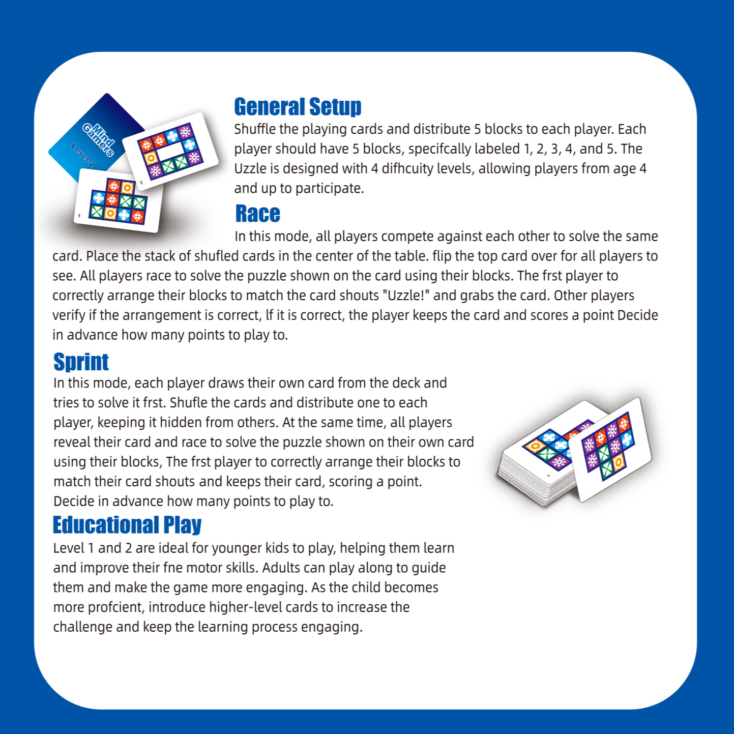 FAST-PACED AND ACTION-PACKED: Play individually or with up to 4 players per game. You can play with unlimited players if you get extra games. It’s fun because these players race to crack the puzzle on the card by flipping, spinning, and merging identical sets of 5 patterned blocks. Sharp eyes, fast hands, and quick minds prevail in this fun-filled pattern-matching frenzy!