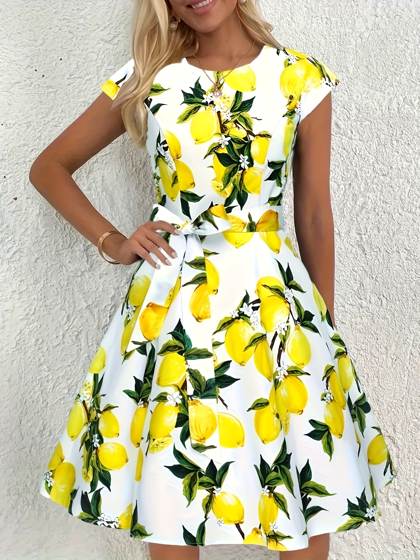 Lemon Print Chic Dress - Flattering Crew Neck, Cap Sleeves & Belted Waist